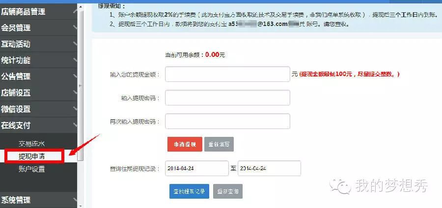 2.客户在商家微信店铺下单,通过支付宝在线支付完成交易后,商家可以在我们微信点单后台管理系统中申请提现。