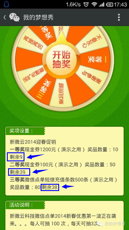 针对之前大转盘抽奖中心,前台奖品只显示奖品总数,不显示奖品剩余量的问题现也已优化好,如图: